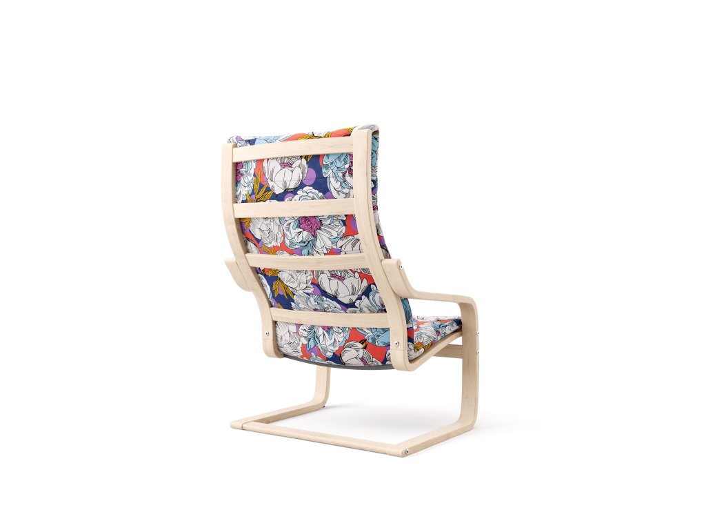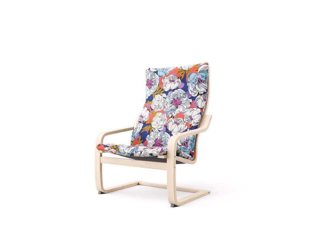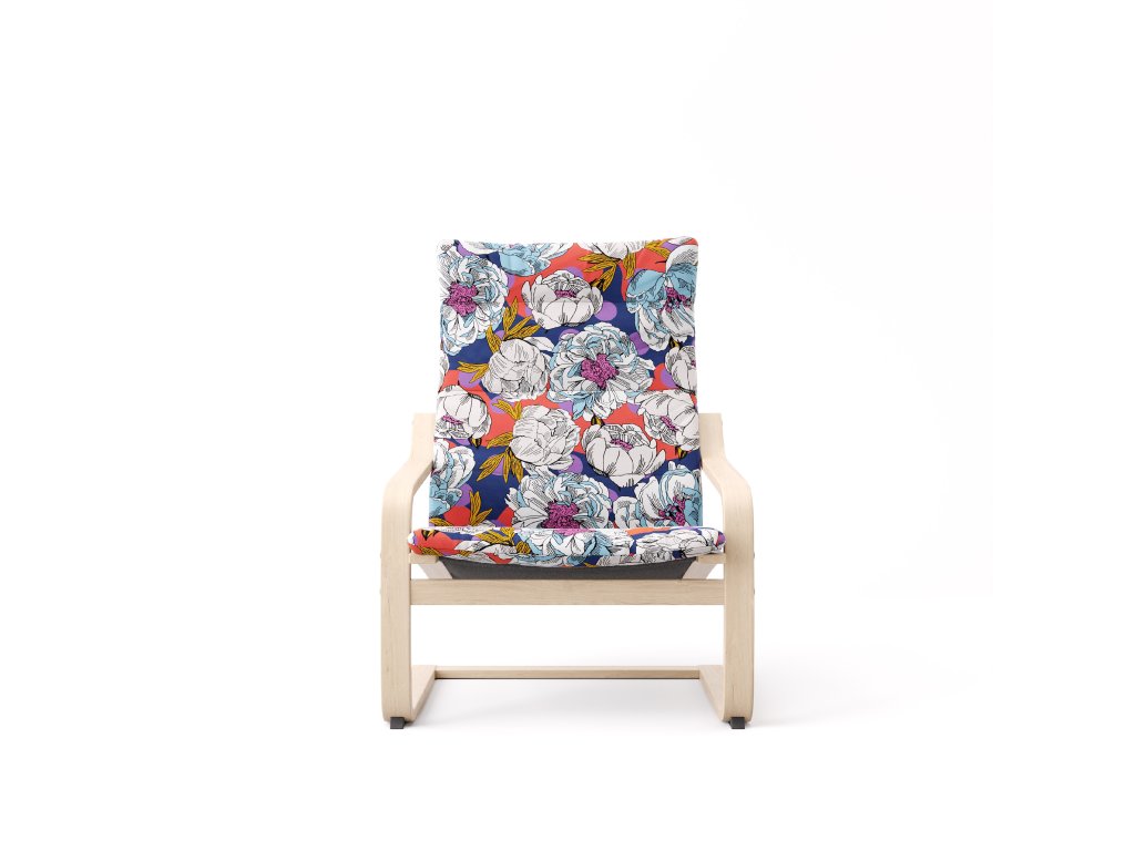 The Poang Classico cover by Artefly is the right solution for lovers of classic floral patterns. Refreshing this traditional motif is the geometric background of purple polka dots overlaying a dark blue ground with red puffs. The final layer of the motif is white and pink rich peony flowers.